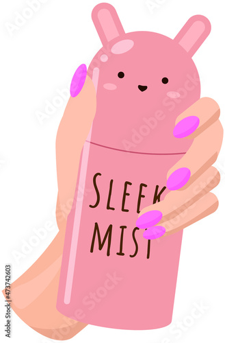 Hand with spray bottle sleek mist. Cosmetic aerosol pink item. Rose plastic tube with cute animal ears. Face and body skin care product in woman hand. Korean decorative cosmetics, skin moisturizer