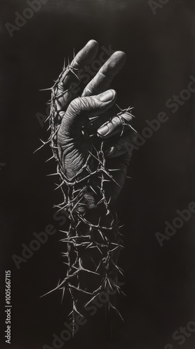 hand, thorn, black, background, symbolic, dark, emotion, contrasting, texture, monochrome, conceptual, artistic, dramatic, pain, sharp, surreal, mood, expressive, gesture, tension, mysterious, enigmatic, powerful, detail, white, visual, thought provoking, stark, abstract, metaphoric, unique, captivating, gripping, intriguing, minimalist, striking