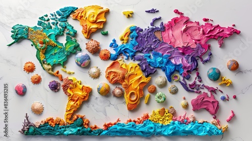 Handcrafted plasticine world map with colorful continents, each adorned with unique patterns and textures
