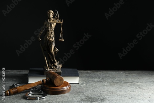 Handcuffs, judge's gavel, Lady Justice figure and book on grey textured table, space for text