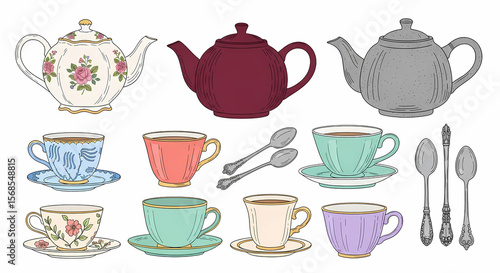 Hand-drawn collection of 11 cozy tea-time illustrations. Feature 3 steaming teapots (floral china pattern, matte burgundy, speckled grey), 5 mismatched teacups (willow pattern blue, solid coral, mint