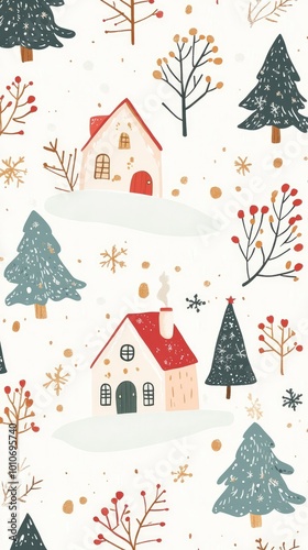 Hand-Drawn Cute Christmas Seamless Pattern with Tiny Houses and Snow on White Background