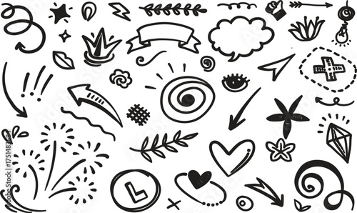 Hand-drawn Doodle Set A Collection of Whimsical and Artistic Elements for Creative Projects, Featuring Arrows, Hearts, Stars, and More Decorative Symbols