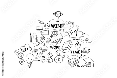 Hand-drawn doodles related to success and work, such as a trophy and lightbulb, on a white background, representing business concepts