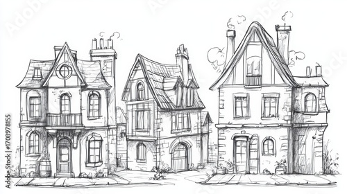 Hand-Drawn Elegant Architecture Sketch of Vintage Houses with Unique Features, Windows, Roofs, and Charming Details in Black and White