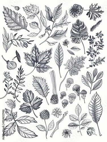 Hand-drawn elements of nature, including leaves, flowers, and trees, with intricate details.