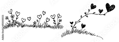 hand-drawn grass and flowers with heart petals black vector drawing