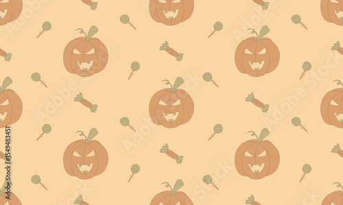Hand-Drawn Halloween Seamless Pattern with Pumpkins in Soft Beige Tones