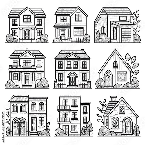 Hand-Drawn House Icons – 9 Vintage-Sketch Homes & Apartments Set