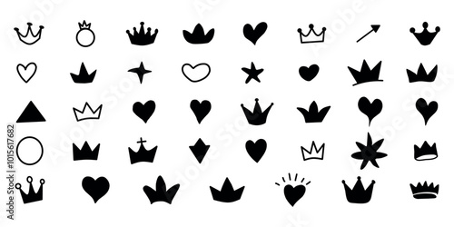 hand-drawn icons set, black and white doodles, crowns, hearts, stars, minimalist design, royal and love symbols, vector sketches, simple shapes
