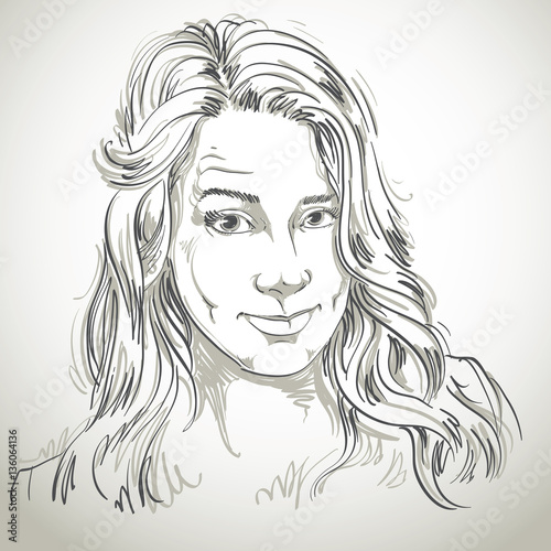 illustration, vector, posing, pose, lady, female, woman, girl, young, missy, posture, isolated, adult, people, person, personality, pretty, nice, attractive, good-looking, cute, haircut, coiffure, temper, design, image, graphic, art, artistic, hand-drawn, drawn, drawing, vignetting, calm, portrait, emotion, expression, beautiful, visage, face, picture, caucasian, wrinkle, naive, skeptic, cynic, doubt