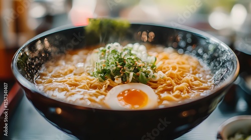 Hand-drawn ramen bowl with rich broth, noodles, and toppings, ideal for food packaging, menu designs, and culinary promotions, vintage illustration style