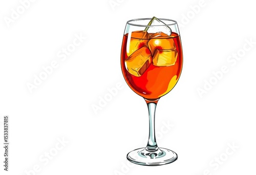 Hand-drawn sketch of an Aperol Spritz cocktail in a classic wine glass, ice cubes visible, vector illustration, sketch illustration