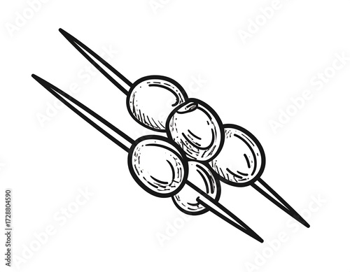 skewer, food, round, ball, drawn, line, black, white, grilled, asian, cookery, illustration, simple, vignetting, graphic, foodstuff, snack, delicious, vector, pictogram, outline, drawing