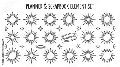 hand-drawn sun glare flares and halos outline elements set created for planners scrapbooking and journaling isolated on white background