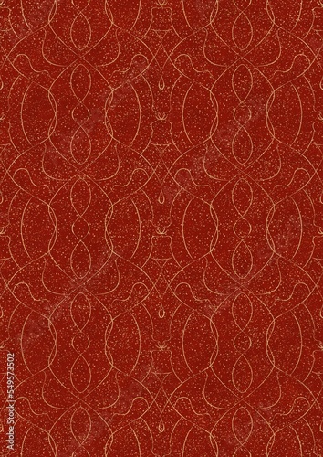 Hand-drawn unique abstract symmetrical seamless gold ornament with splatters of golden glitter on a bright red background. Paper texture. Digital artwork, A4. (pattern: p08-1e)
