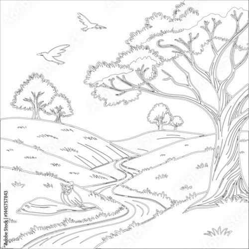 landscape, tree, water, hand-drawn, vector, illustration, outline, black-and-white, nature scene, forest, duck, duck pond, lake, sea, meadow, owl, bird, animal, bush, sky, cloud, rural, river, plant, nature, paint, draw, colours, dye, page, tattoo, black, white, graphic, background, tree, cloud, grass, scenic, drawing