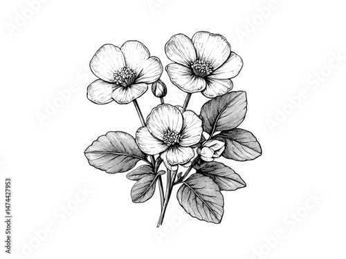 Hand-drawn vintage botanical sketch of marsh marigold bloom, antique floral illustration, rustic water bloom motif, Black sketch, engraved decor, trendy floral art, old engraving style.