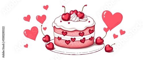 Hand-drawn vintage cherry cake, hearts, cream frosting Perfect for Valentine's, birthday, wedding, pastry, adorable