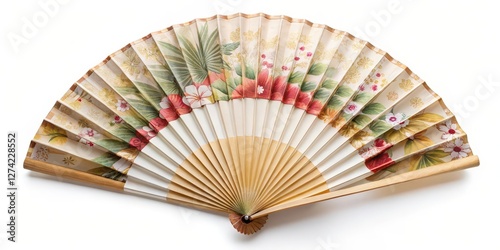 fan, hand, hand-held, bamboo, wood, floral, flower, design, paper, painted, artifact, vintage, antique, accessory, summer, heat, cooling, decorative, elegant, oriental, asian, aesthetic, craft, hand-made, texture, pattern, background, white, isolated, object, studio, photo, image, closeup, detail, illustration, art, colours, pale, light, rib, fold, open, item, still life