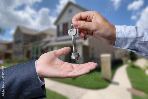 Handing Over the House Keys in Front of a Beautiful New Home.