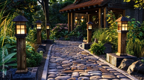 hand-laid cobblestone pathway leading to a Craftsman home, lined with wooden lanterns and lush plantings