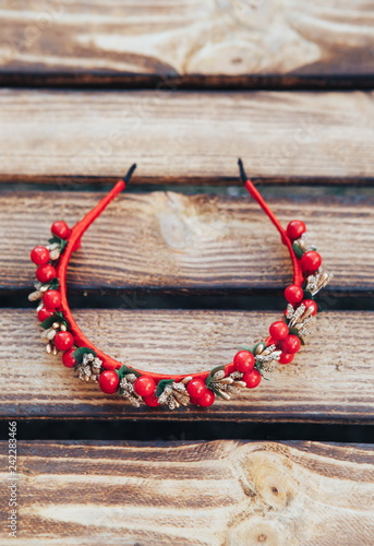 Handmade hoop Red flowers. Red berries hair band on wooden background. Top view