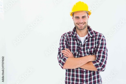 young adult, man, male, caucasian, work, repairman, occupation, men at work, professional, repair, job, maintenance, handyman, profession, shirt, foreman, manual, working man, hard hat, safety, protection, photogenic, smart, isolated, cut-out, carpenter, contractor, hard hat, technician, standing, smiling, happy, arms crossed, chequered, yellow, copy space, white background