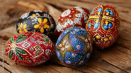 Hand-painted Easter eggs with intricate designs in vibrant colors like red, blue, black, white, yellow, green, orange,