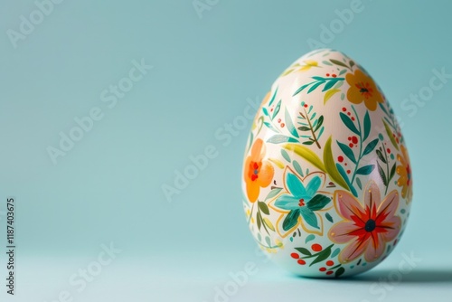 Hand-painted sustainable Easter egg with abstract floral pattern isolated on a soft blue gradient background