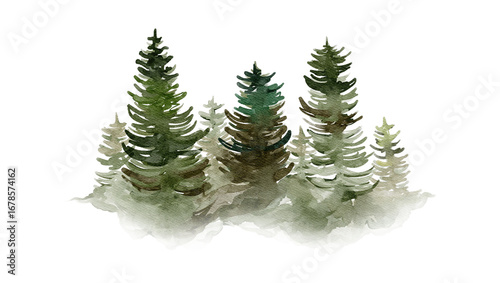 Hand-painted watercolor illustration of a serene evergreen forest. An artistic depiction of pine trees with a misty, foggy ambiance