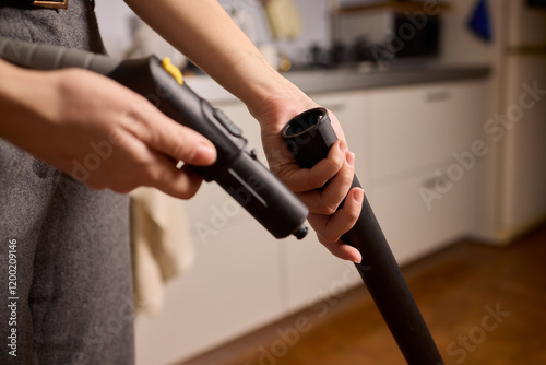 Hands actively using a vacuum cleaner in a clean and modern kitchen environment