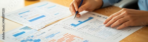 Hands adjusting printed financial statements laid out on a meeting table, Financial Statement Review, Consultant discussing cash flow and profit margins