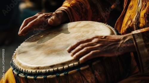 hand, drum, drumming, music, instrument, percussion, skin, leather, rope, wood, rythm, beat, playing, musician, finger, wrist, palm, knuckle, nail, surface, texture, round, circle, pattern, detail, closeup, brown, light, dark, sound, culture, tradition, performance, practice, skill, artisan, craft, creative, hand-made, ethnic, garment, sleeve, yellow, orange, sharpened, artistic