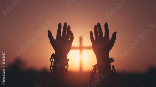 Hands are lifted towards the sky during sunset. Chains are seen on the wrists. A cross stands in the background capturing a moment of reflection and significance.
