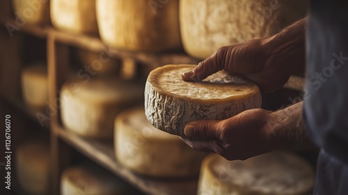 cheese, wheel, round, hand, holding, dairy, artisan, craft, food, epicure, aged, mature, texture, rind, creamy, smooth, delicious, favor, taste, aroma, scent, production, making, process, farmer, handcraft, traditional, local, regional, organic, natural, healthy, nourishment, protein, calcium, delicacy, culinary, gastronomy, ingredient, receipe, preparation, quality