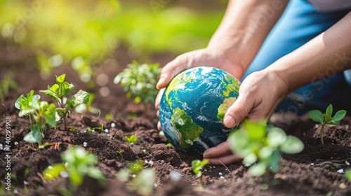 Hands carefully planting a small globe into fertile soil, surrounded by young plant sprouts, illustrating the nurturing of our planet.