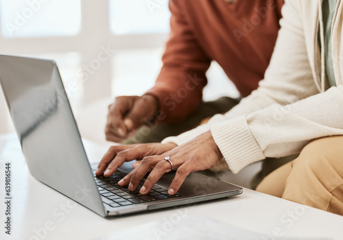 Hands, closeup and a couple with a laptop for internet, connection or research. Table, home and people typing on a computer for mortgage information, email or together for a movie online on a pc