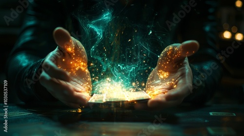 Hands conjuring glowing magical energy from a tablet in a dark setting