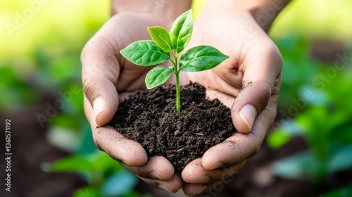 Hands cradling a young green plant in rich soil, symbolizing growth in a lush garden