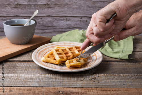 waffle, hand, cut, hot drink, cup, dessert, sweet, breakfast, gold, plate, morning, sweet food, food, snack, kitchen, coffee cup, pile, homemade, fresh, bakery, food and drink, delicious, baked