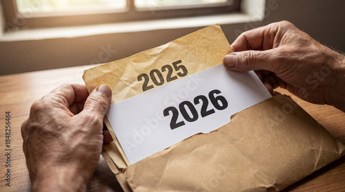 2025, 2026, future, hand, envelope, anticipation, year, number, paper, revealing, opening, timeline, planning, destiny, new year, opportunity, concept, table, wood, light, window, hope, date, appointment, meeting, strategy, business, vision, growth, calendar, ambition, achievement, challenge, change, development, discovering, goal, idea, management, progress, season, time, target, work, journey