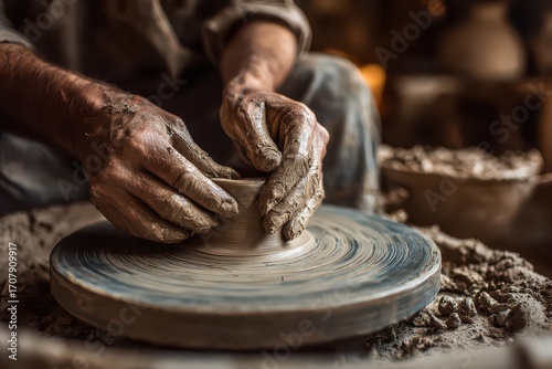 Hands expertly shaping clay on a pottery wheel during a cultural festival celebrating traditional crafts and arts in a vibrant studio setting