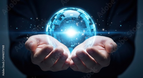 Hands gently cupping a glowing blue energy sphere with digital connections and particles