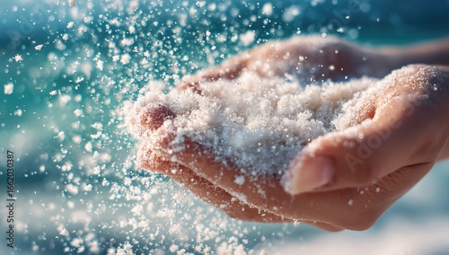 sand, hand, ocean, beach, grain, white, water, sea, coastal, nature, sunlight, texture, fine, loose, particle, flowing, falling, airborne, cupped, palm, finger, skin, soft, smooth, splash, spray, blur, background, summer, escape, relaxation, calm, serene, peaceful, tranquil, bright, day, light, wave, horizon, drifting, scattered, movement, gentle, effortless, beauty, photo, image, scene