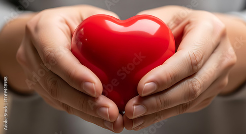 Hands gently hold a vibrant red heart, symbolizing love and care, perfect for Valentine's Day promotions or healthcare campaigns that evoke compassion