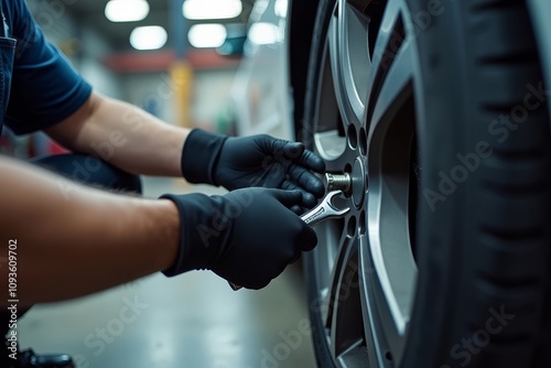 Hands, gloves, wrench, car tire, garage setting - automotive service background or professional mechanic service