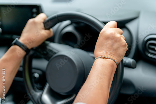 Hands grip the steering wheel of a car while driving through the city during the daytime with focus and determination
