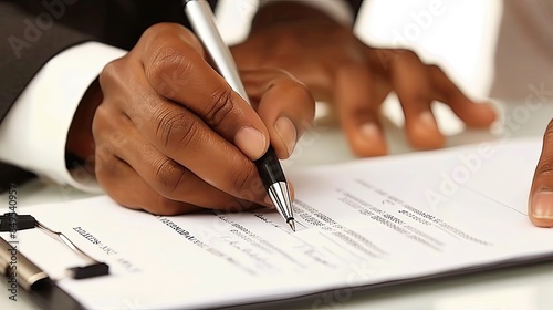 hands holding a pen and papers, signing an official document or contract on a table in a meeting room, with the blurred figures of black business people in the background.