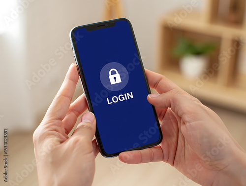 Hands holding a smartphone with a lock screen displaying a login prompt concept